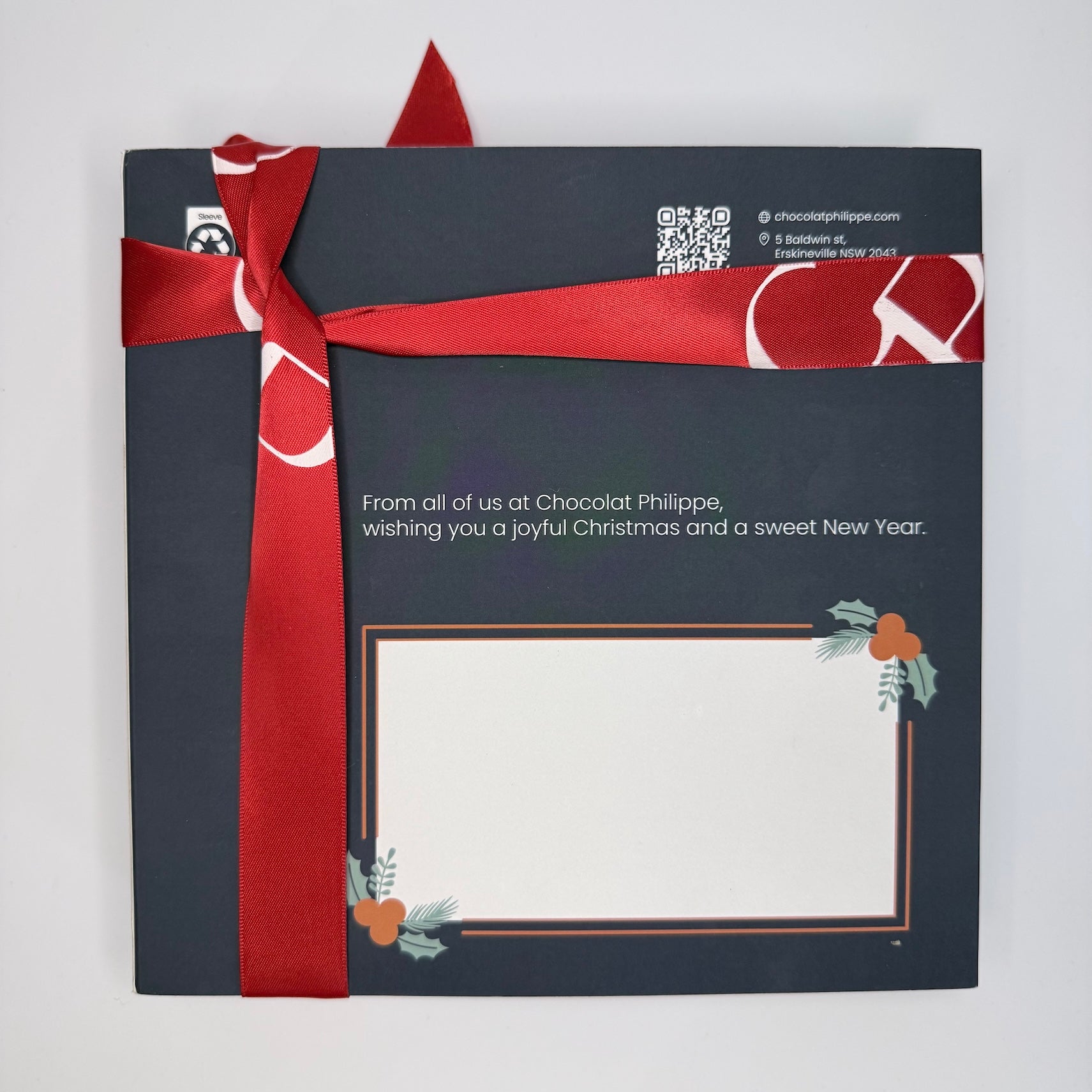 Each box is wrapped with a seasonal End of Year sleeve, created to add warmth and celebration while keeping the understated elegance of Chocolat Philippe. Our luxury formats are finished with a red ribbon and include a space on the back of the sleeve to write a personal message, making these boxes perfect for gifting!
